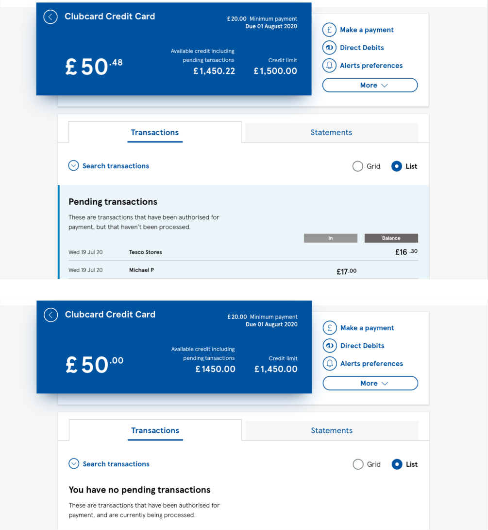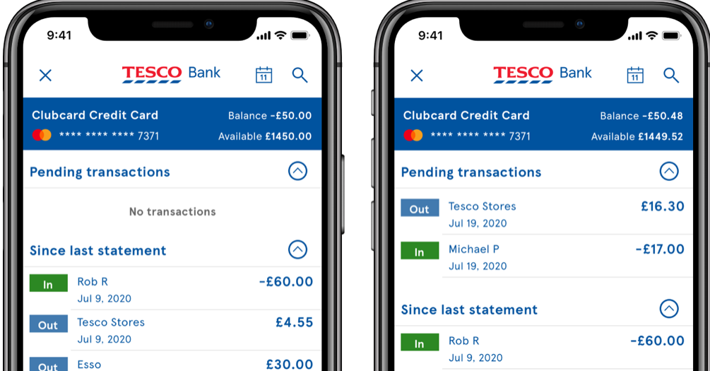 Please use the images to help you calculate your credit balance. For example, the image with pending transactions has a credit balance of £50.48 - £16.30 Tesco Stores + £17.00 Michael P = an updated credit balance of £51.18.
